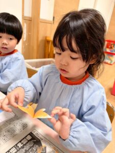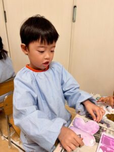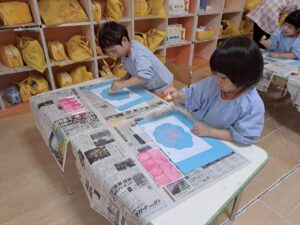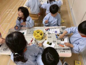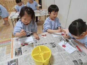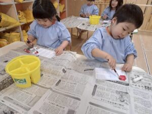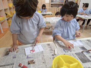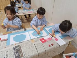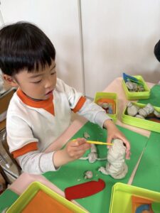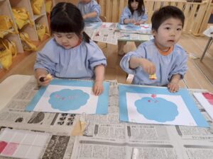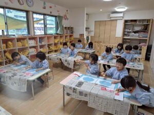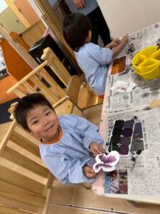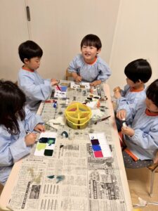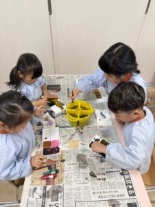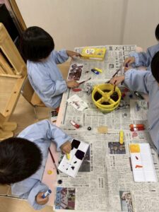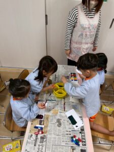 キリン組さんから一人一つ絵具セットが配られ自分の絵具セットを使って初めての製作です✨