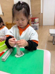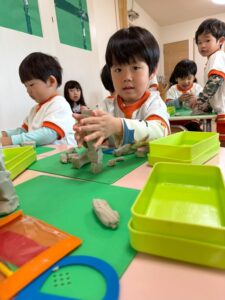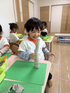 「どのくらい高いお家ができるかな?」をテーマにして粘土を積み重ねて高いお家を作りました♬