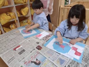 ちょうちょの製作ではちょうちょの羽の模様をデカルコマニーという塗り方をしてみました😊