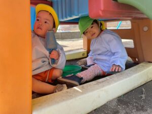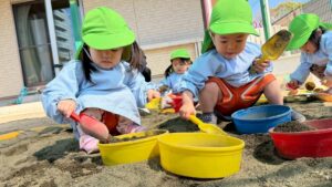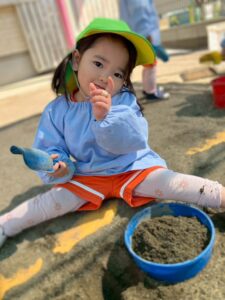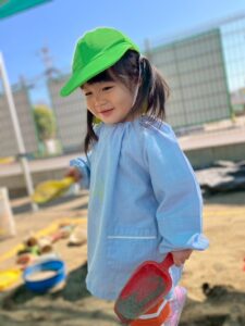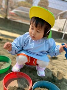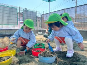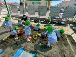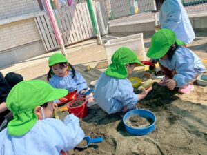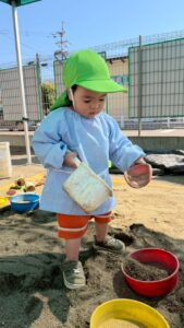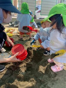 スコップやバケツなどを使って、お友だちや先生とたくさん遊んでいきます♬