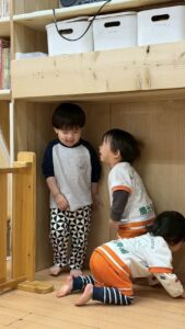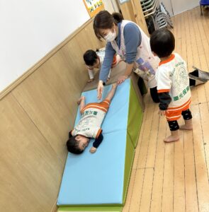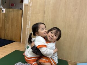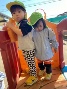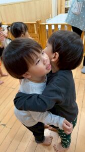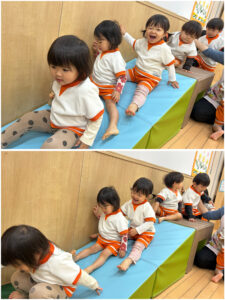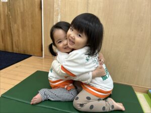 スロープの下で、手を広げて待っているお友だちのところに、スロープを滑ったお友だちが抱きついていました^^