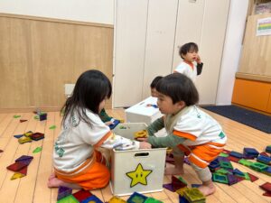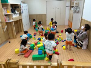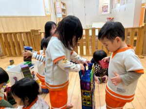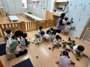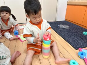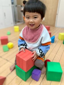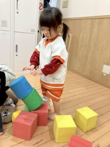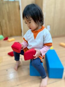 ほとんどの子がスポンジ積み木は初めてだったので、出すとルンルン♬
