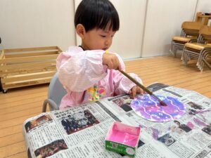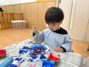 筆で塗る感覚や、色の混ざる様子などを味わいながら、夢中になって塗っていきます♬