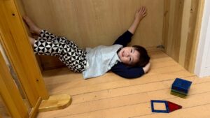 積み木の穴から先生が見えるかな?
