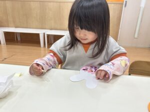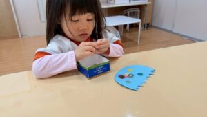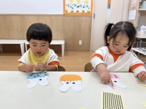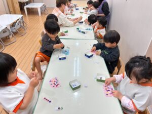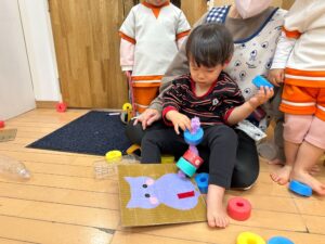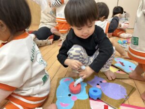 上手にゾウの鼻やねこのしっぽにプールスティックを通したり、シール剥がしをしたり、みんな夢中になって遊んでいます🎶