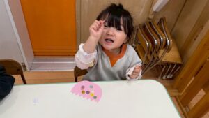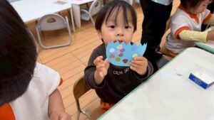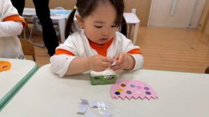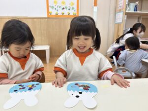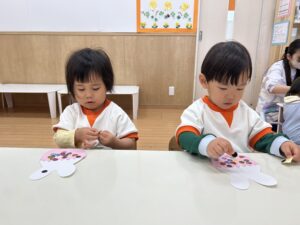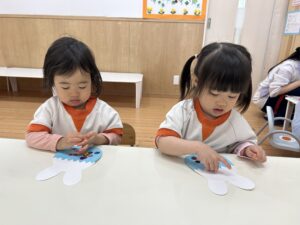 「今日は、うさぎさんの目と鼻を貼ろうと思います」と活動についてのお話をすると、「やった~!」と顔を見合わせて喜ぶみんな、可愛すぎます^^