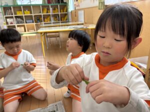 苦戦している子も多い中、すごいスピードで上手に筋を取っていく子もいました!お友達が出来なかった分を一緒に協力して筋を取ってあげる姿はさすがライオン組さん♪