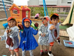 らいおん組さんは雨の中、頑張って掘りました。掘ったあとはお部屋に戻ってサツマイモの絵を描いていました☺️晴れずに残念でしたが、絵には雨や大きなサツマイモが描かれていて、素敵な思い出になったと思います🍠