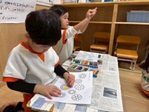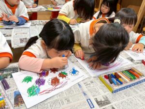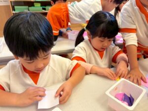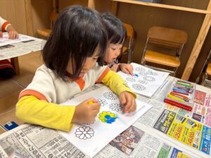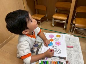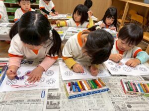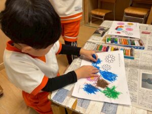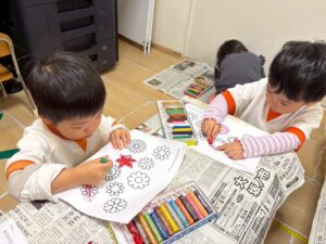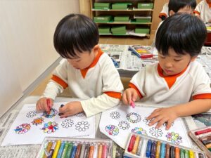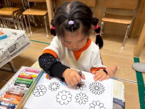 毎日お仕事を頑張ってくださっている保護者の方を思いながら、子どもたちは一生懸命に折り紙でお花を作ったり、お花の塗り絵をしたりしました。