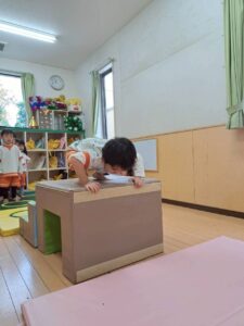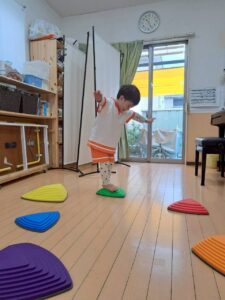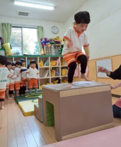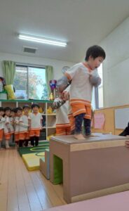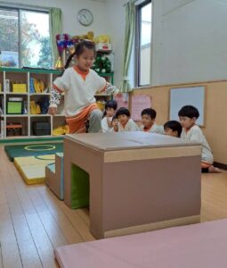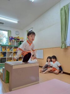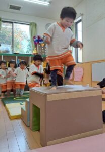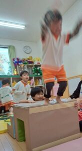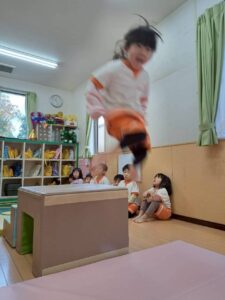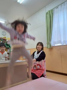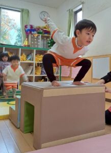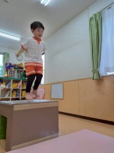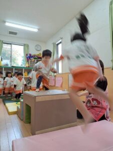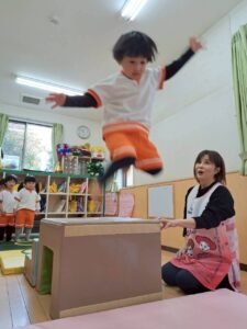 子どもたちが大好きな『高いところから飛び降りる』という動きを安全に配慮して思い切りやらせてあげたいと思い、でもすぐに飽きるかなぁと心配しましたが、なんと30分以上も飽きることなく飛び続けました 笑