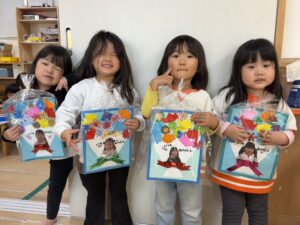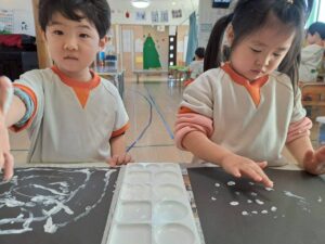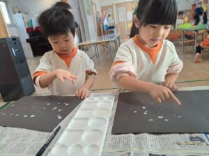 ぬるっとした感触、紙にポンポンとスタンプする心地よさを思う存分楽しんだ子どもたちでした😊