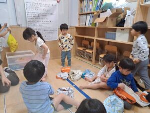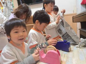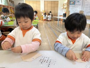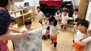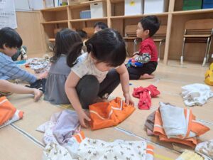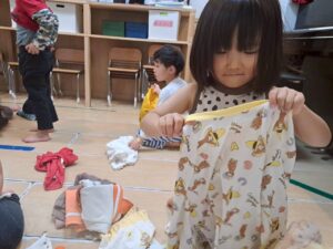 「脱いだお洋服はきれいに畳もうね」という声かけで、どの子も自分なりに一生懸命畳もうとする姿が見られるようになりました。