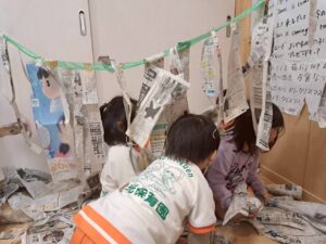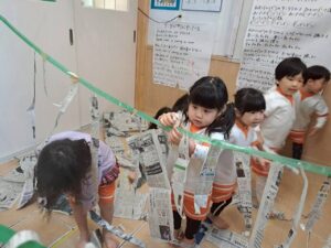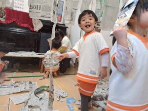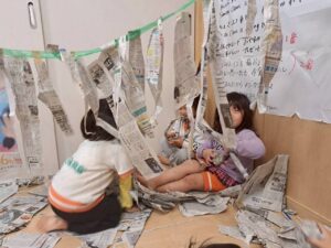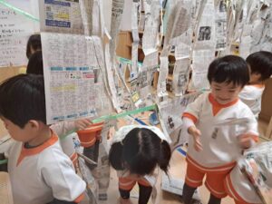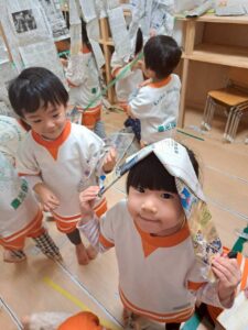 新聞紙だけで、こんなに遊べる子どもたち。遊びの天才ですね😊