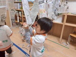 いつもの新聞紙遊びに加えて、この日はセロハンテープの使い方を練習しました。