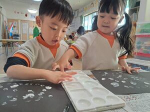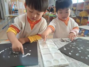黒い画用紙に白い絵の具を指につけて、雪を降らせました❄️