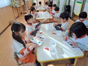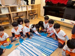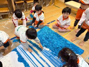 きりん組さんが、雪のところと初日の出のお日様を担当してくれて完成しました。
