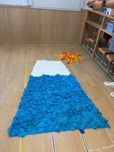 富士山の下絵にお花紙をみんなで丸めてペタペタと貼りました。