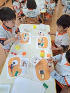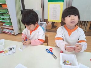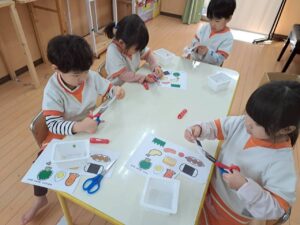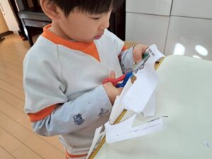 これまでは一回切りや直線を切る練習をしてきましたが、今日はいきなりお弁当の具材を切ることに挑戦です。