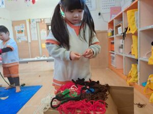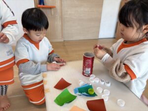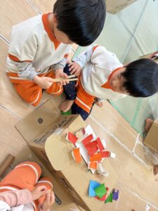 材料を前に作りたいものを聞き、同じものを作りたい子で共同作業をしました。