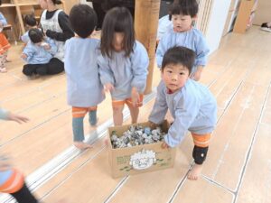 〰️きりん組さんと一緒に新聞紙をギュッギュッと握って丸めて豆作り😊〰️