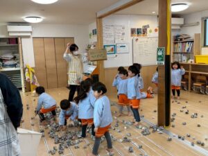そして、自分たちの鬼を並べて的当てゲームのはじまり〜。