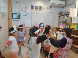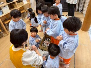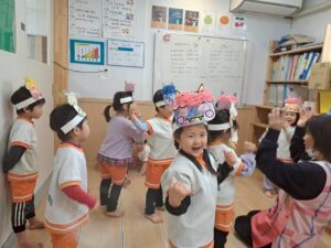 どこからともなく「おにはそと、ふくはうち、ぱらっ ぱらっ ぱらっ ぱらっ まめのおと〜♪」と歌い始め、みんなで大合唱🥰