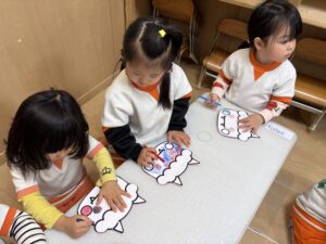 鬼のお顔を好きな色で塗っています。