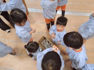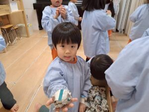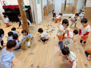 〰️きりん組さんと一緒に新聞紙をギュッギュッと握って丸めて豆作り😊〰️