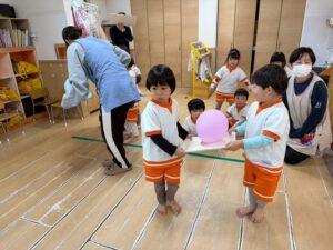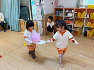 そーっと、そーっと運ばないと風船が落ちてしまう、二人の呼吸をあわせないと難しいゲーム!思い切り走るゲームもいいですが、こんなのんびりスタートなゲームもいいですね!