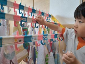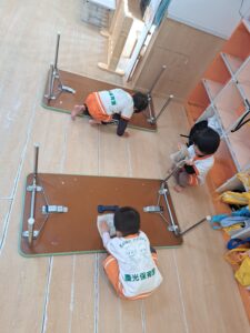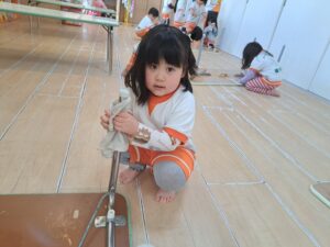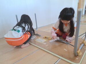 進級するので、これまで使ったお部屋をお掃除しました。お名前シールを剥がしたり、机の裏の汚れを拭き取ったり、ここもしなきゃ、ここも色がついてる!と、はりきって綺麗にしてくれました。