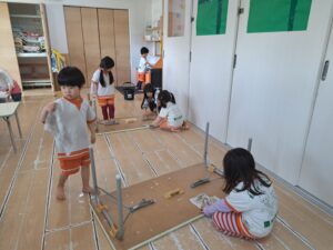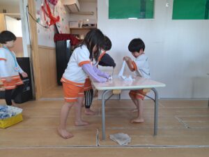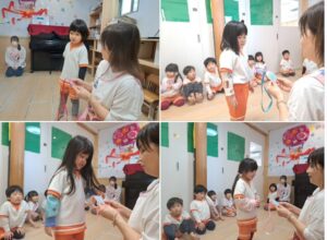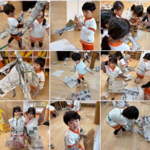段ボールや新聞で自由に棒や、お洋服を作っています。自分で長い棒にまるめることができたり、なんとか自分の思い描く形になったとき、”自分でできた”という達成感や喜びが笑顔から伺えます!