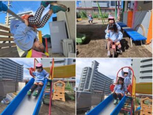 ブランコや滑り台のペンキが綺麗に塗り替えられました!業者さんが作業しているときも、カーテン越しに、「まだつかえないの~?」と、残念そうにチラチラ覗いて見ていたこどもたち。しばらく使えなかった遊具もまた遊べるようになりました🎵